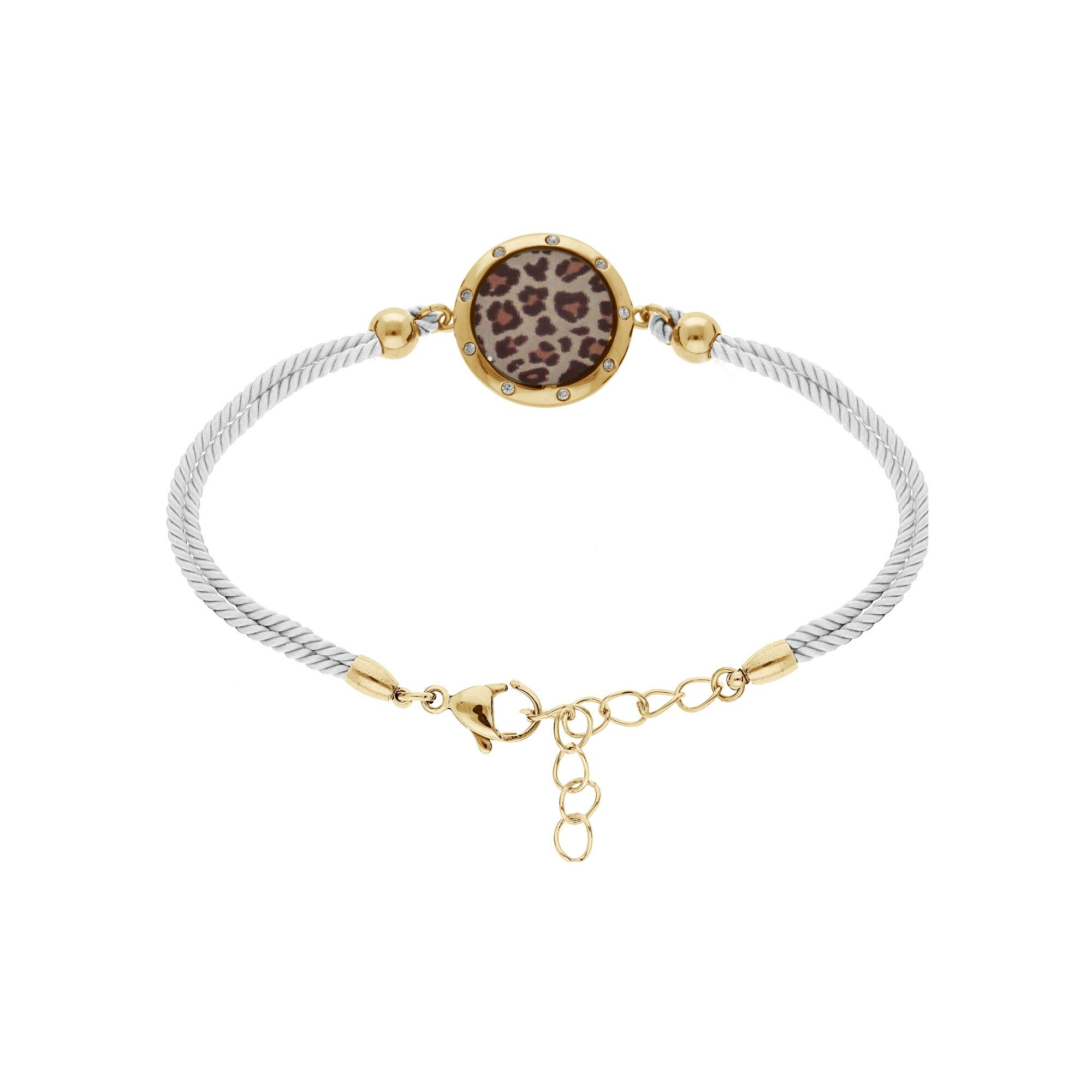 Bracelet acier doré stella mia cordon blanc motif rond avec résine léopard 16+3cm