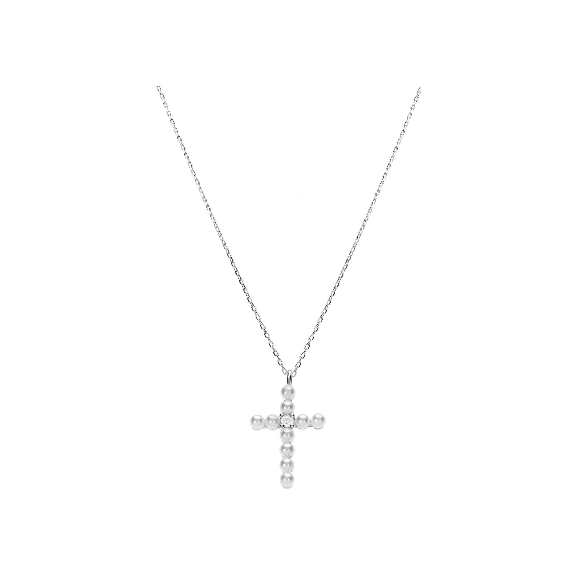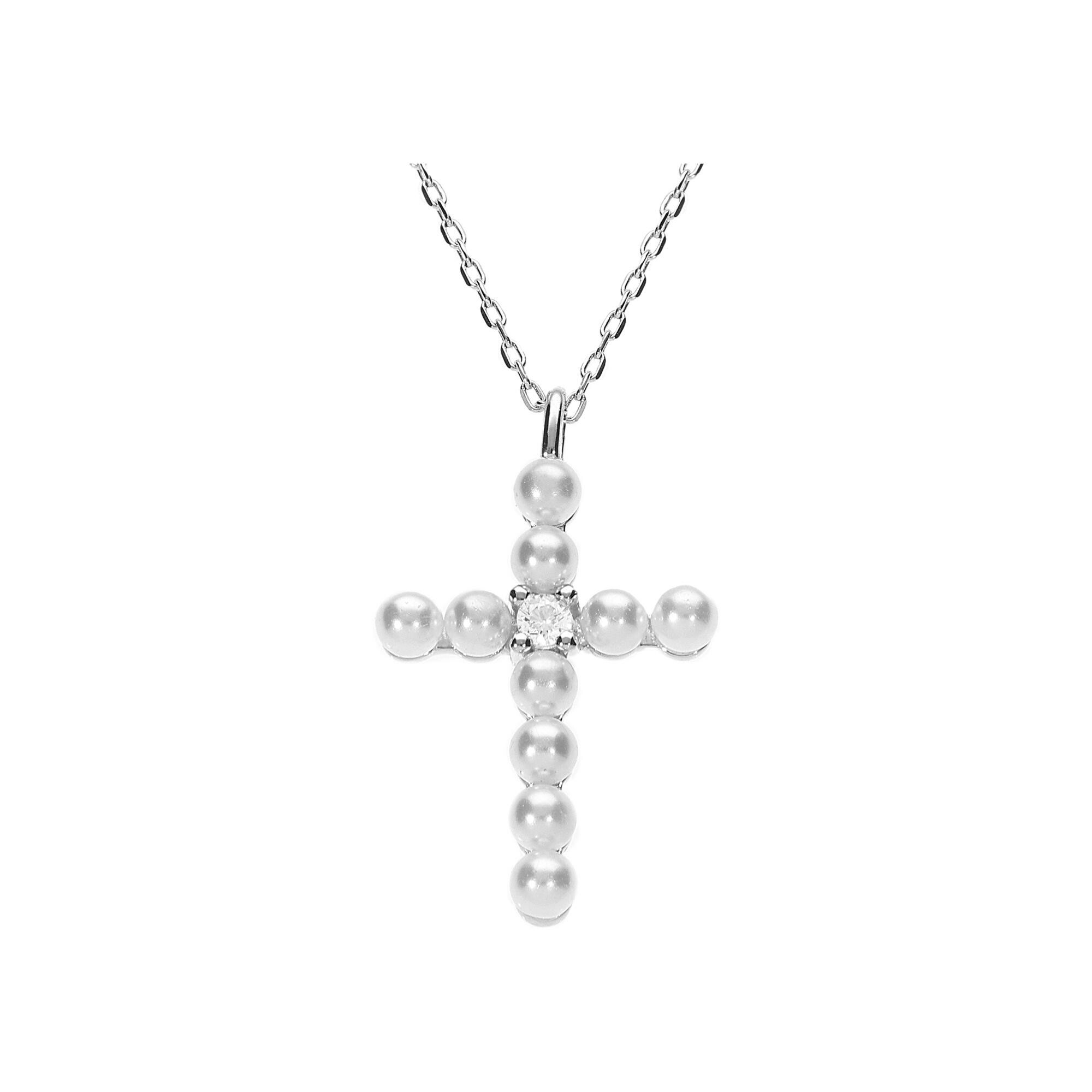 Collier argent rhodié pendentif croix avec 1 oxyde blanc et perle blanche imitation 42+3cm